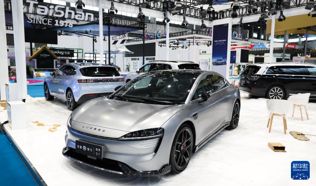 这是4月12日拍摄的第四届中国国际消费品博览会华为展位上的参展汽车。