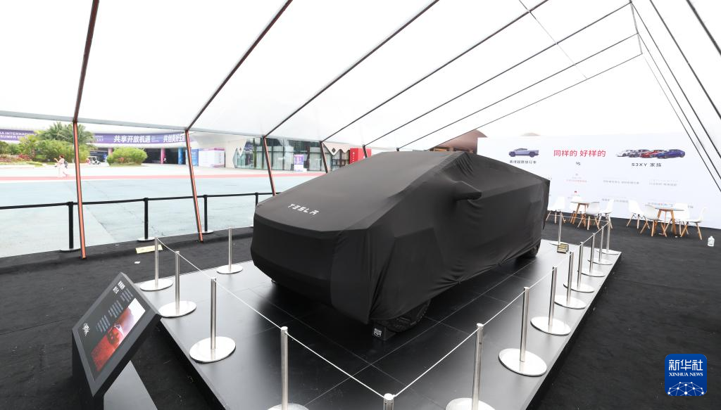 这是4月12日拍摄的第四届中国国际消费品博览会特斯拉展位上的参展汽车。