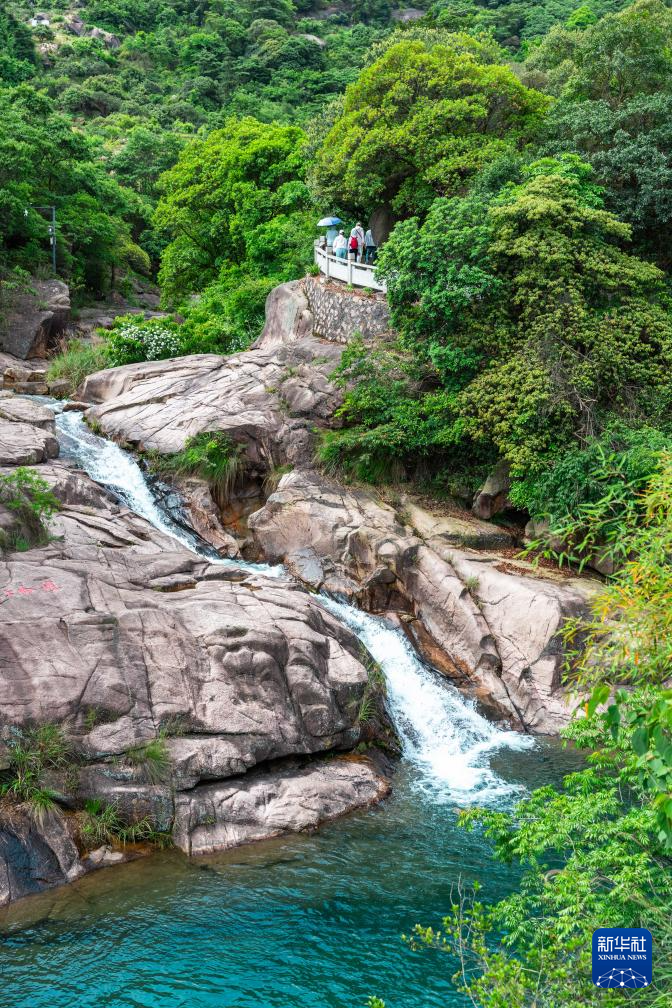 5月14日,人们在浙江省温州市龙湾区大罗山溪水旁赏景游玩(无人机照片)。