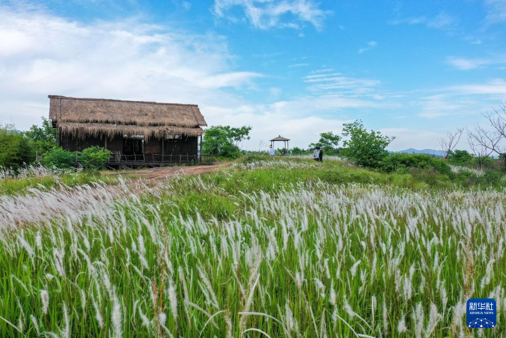 5月13日,在浙江省东阳市六石街道岩口草原影视外景拍摄基地,人们在游玩拍照(无人机照片)。