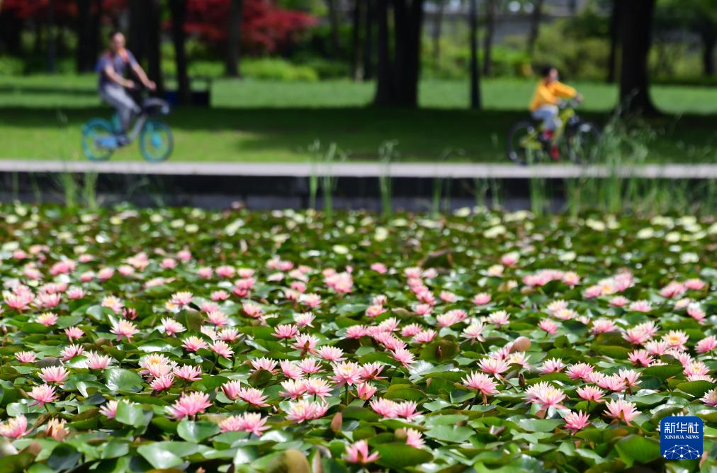5月13日,游人在南京明孝陵景区燕雀湖畔拍摄睡莲。