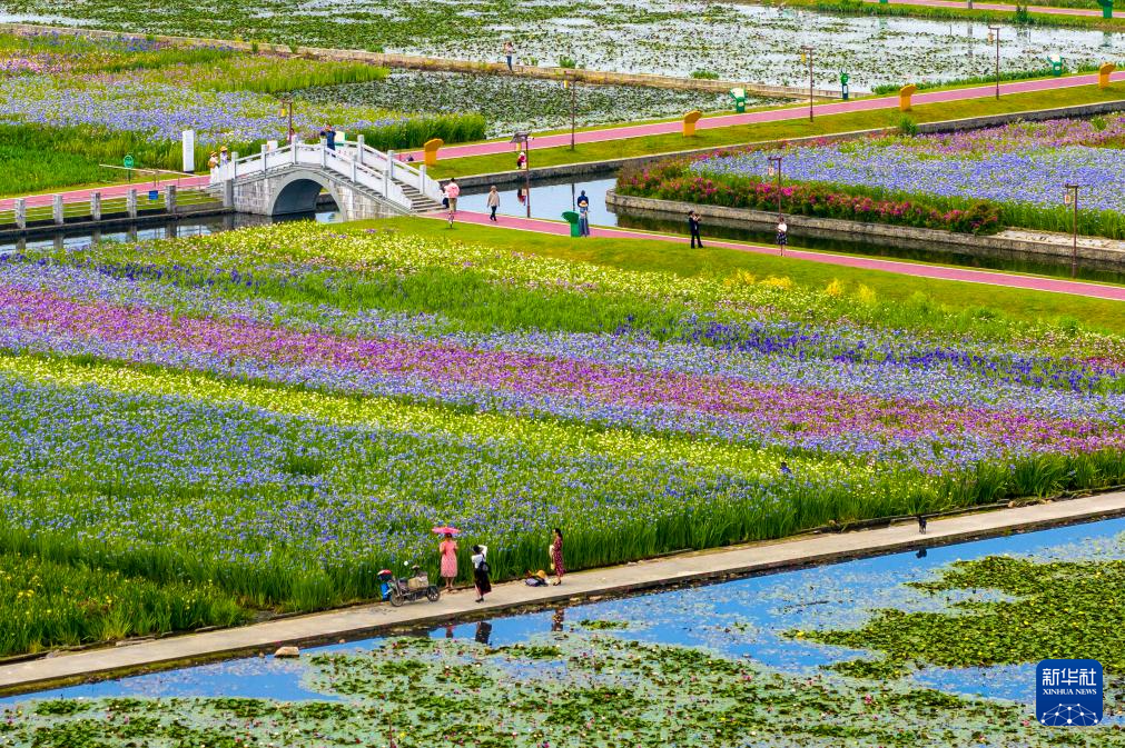 5月11日,市民在江苏省常州市圩墩遗址公园观赏鸢尾花。