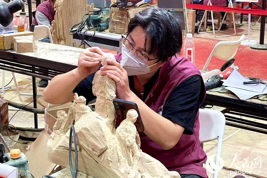 在木雕技能竞赛区,来自全国多个省市的工艺美术大师现场创作。木屑纷飞中,木质清香弥漫会场,参赛者们通过凿、雕、刻、削等多种技法,营造出惟妙惟肖的木雕形象。