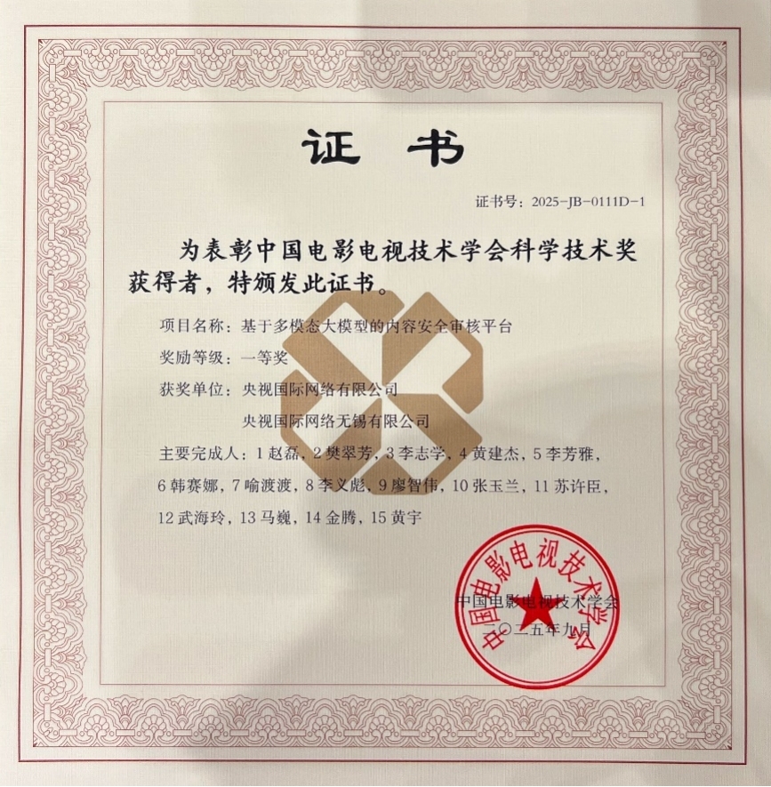 2025年参评项目共172项,经评审委员会评定,获得2025年度中国电影电视技术学会科技进步奖的项目共60项,其中一等奖14项,二等奖20项,三等奖26项。央视网“基于多模态大模型的内容安全审核平台”荣获一等奖。