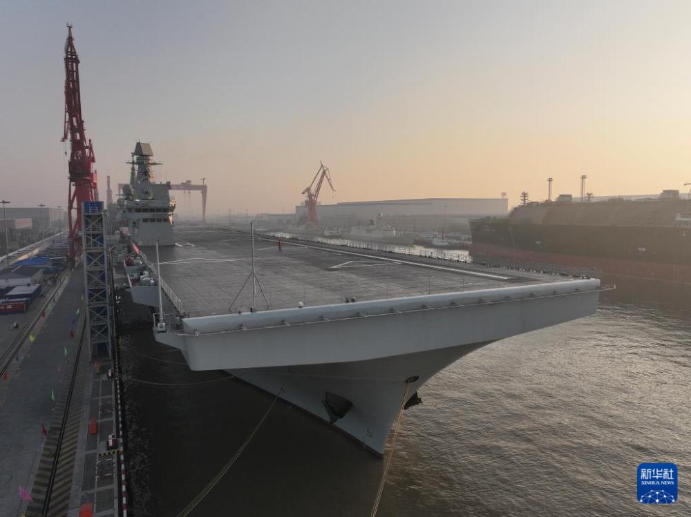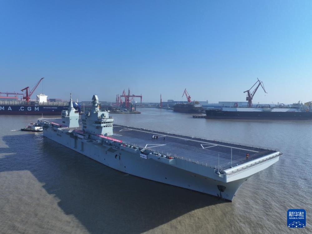 11月14日9时许,我国076两栖攻击舰首舰四川舰从上海沪东中华造船厂码头解缆启航,赴相关海域开展首次航行试验任务。新华社发(张良 摄)