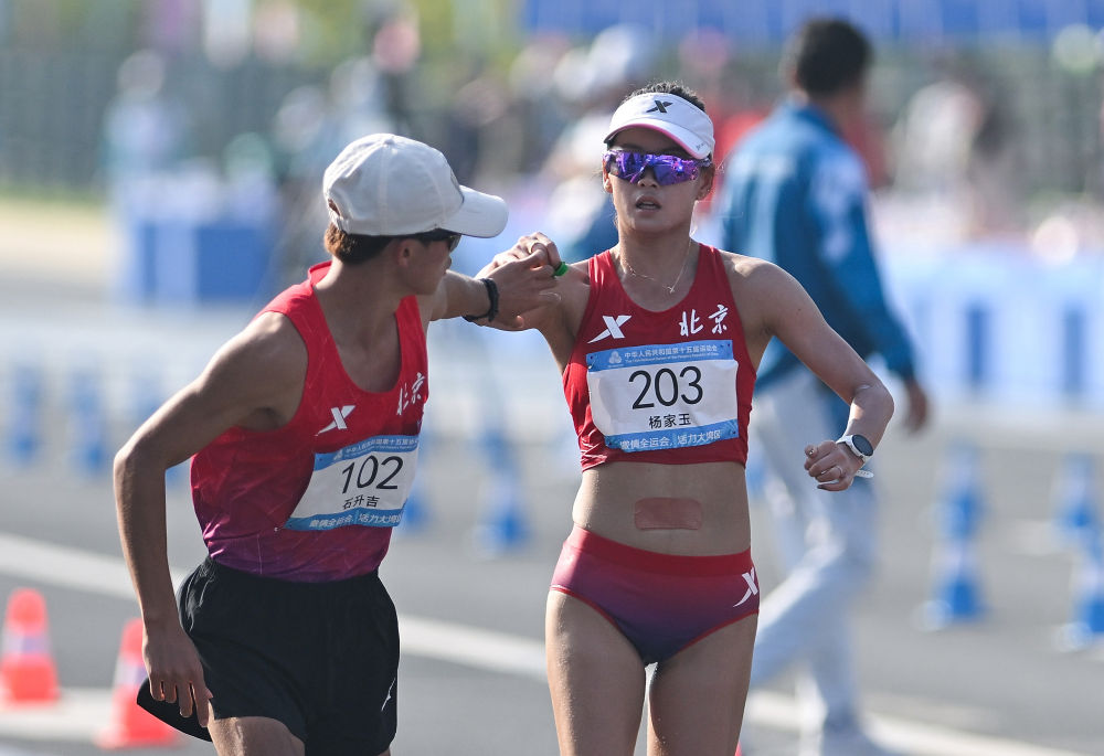 在全运会首次设立的马拉松竞走混合接力中,18岁的石升吉与29岁老将杨家玉携手,为北京队赢得该项目历史首金。