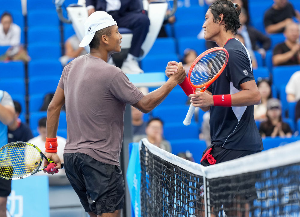 11月17日,张之臻(右)与尼敦坚赞在赛后握手致意。新华社记者 颜麟蕴 摄