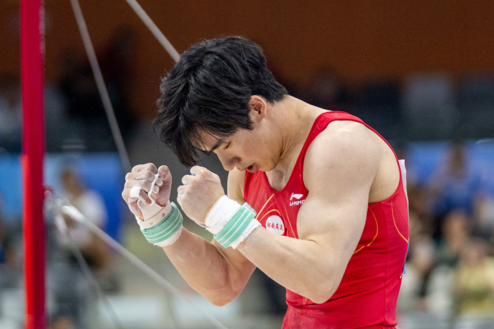 体操赛场,湖南名将张博恒在几次冲金受挫后,以一套干净利落的动作问鼎男子单杠;四川队邹敬园则加冕男子双杠。