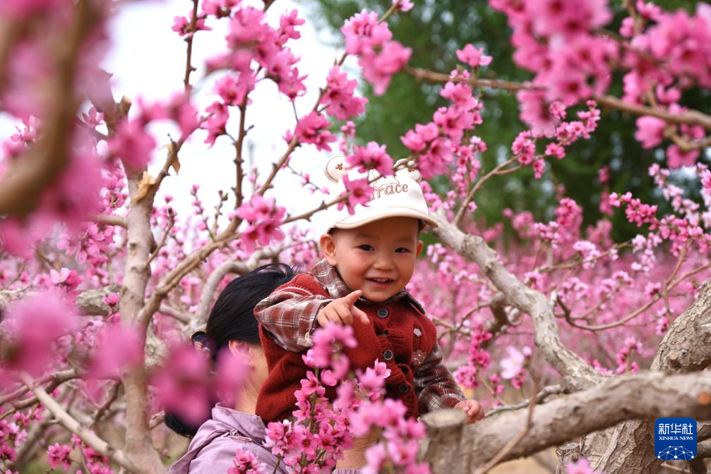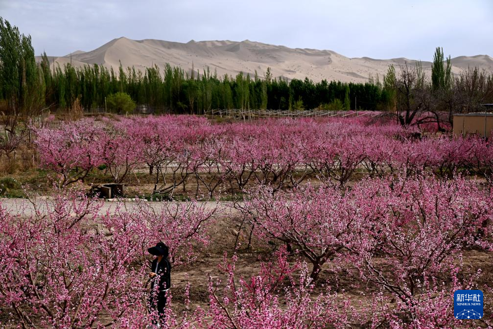4月12日,游人在甘肃省敦煌市七里镇桃产业示范基地游玩。