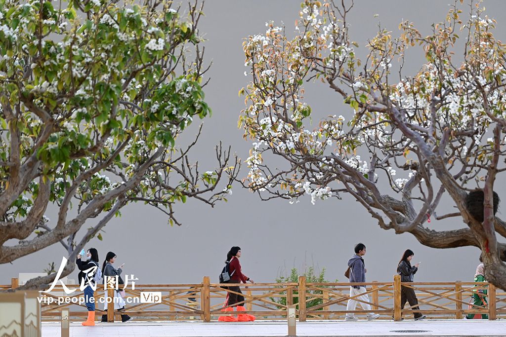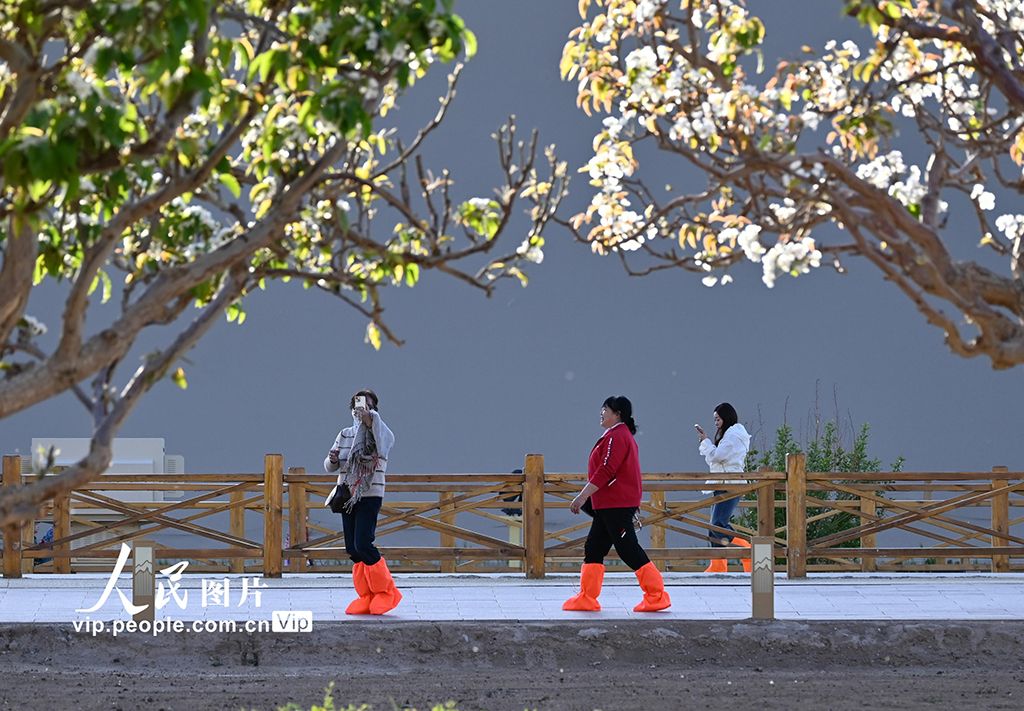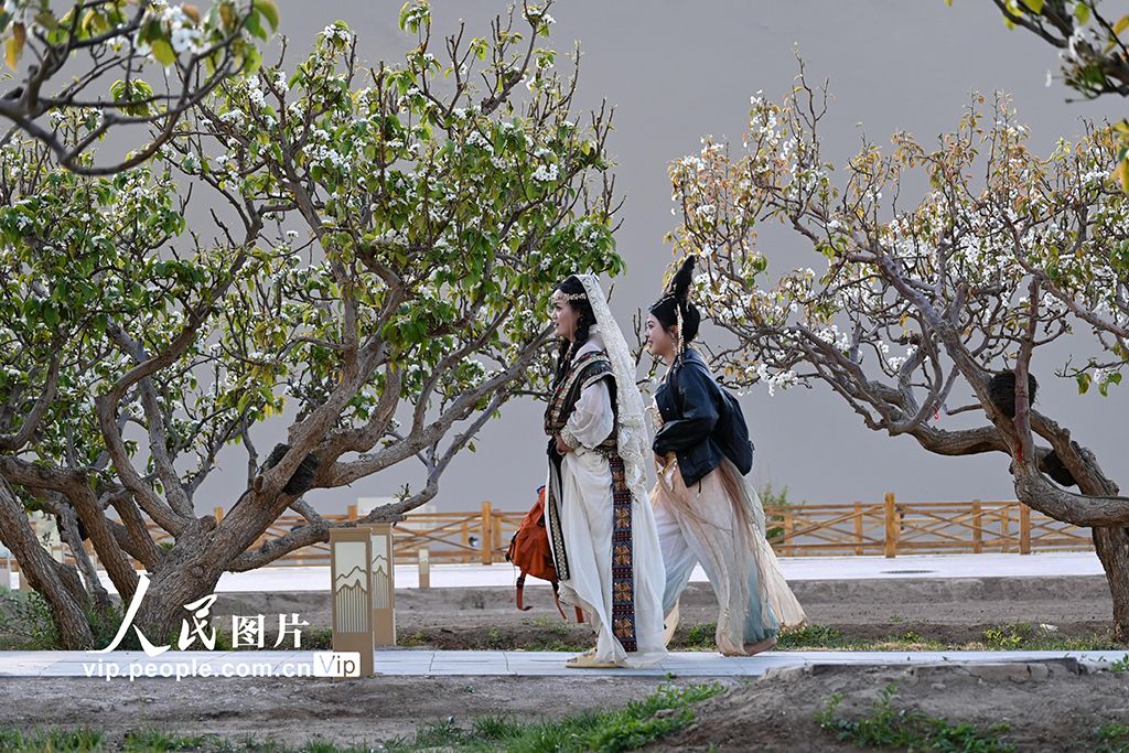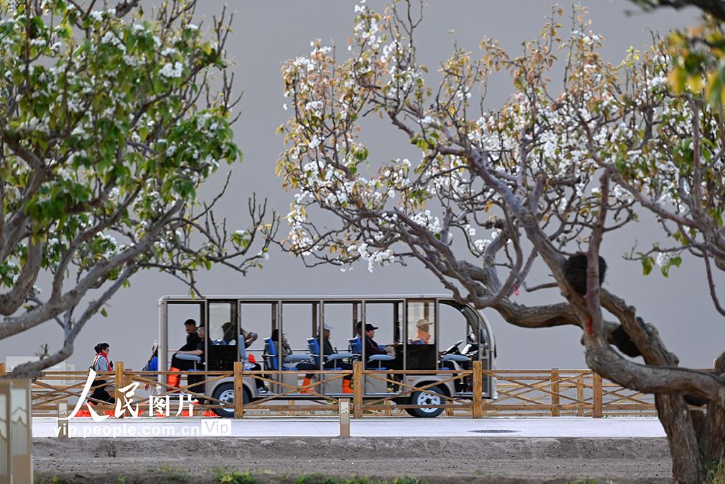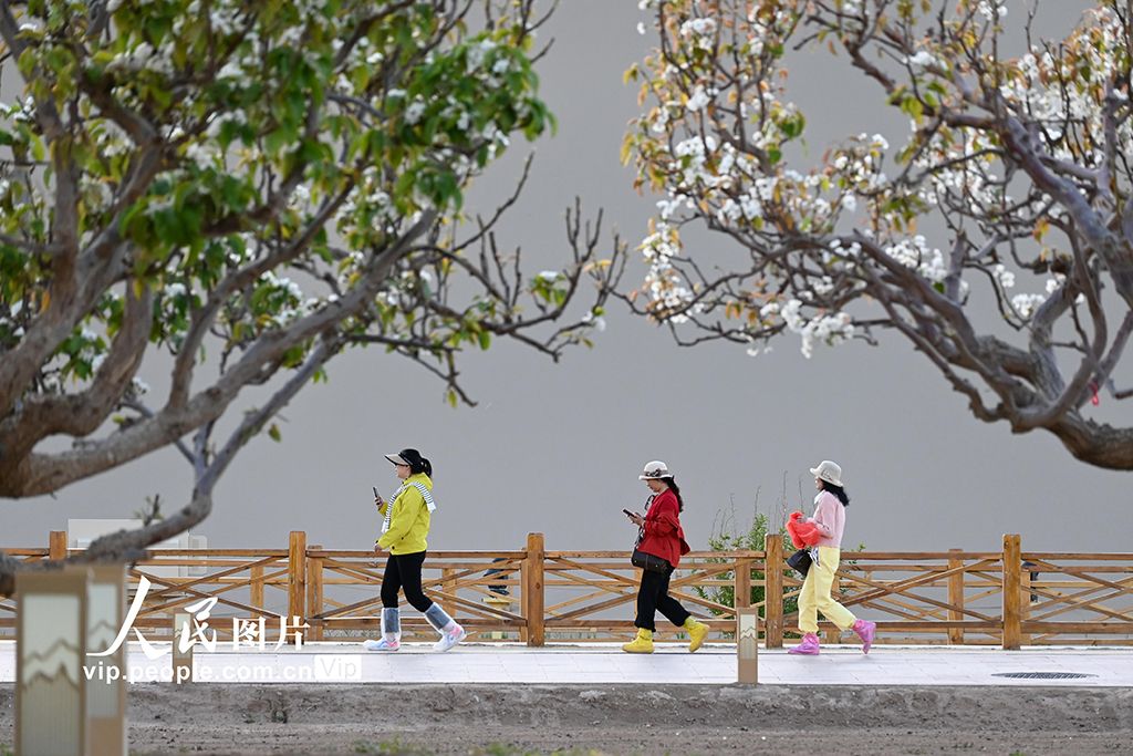 四月中旬,甘肃敦煌鸣沙山下繁花似锦,游客畅游大漠,尽享明媚春光。王斌银摄(人民图片网)