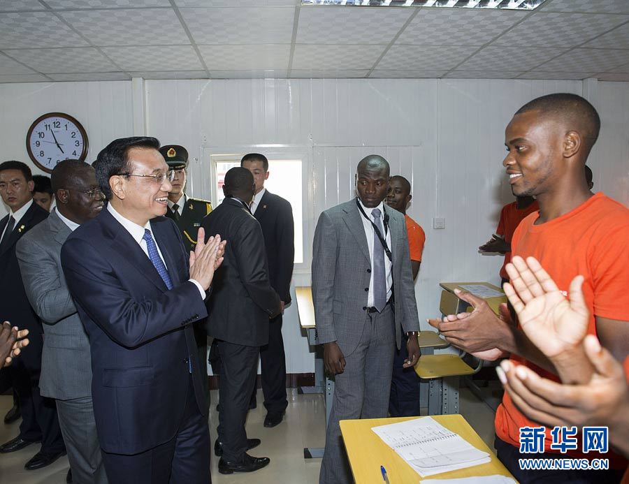 5月8日,国务院总理李克强在安哥拉首都罗安达参观中信百年职业学校。这是李克强在学校教室内同正在上课的学生互动交流。新华社记者王晔摄
