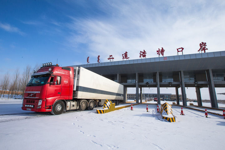 2月7日,果蔬车辆从二连出入境边防检查站“农副产品绿色通道”快速通关。新华社发(郭鹏杰摄)