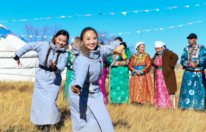 2018年11月9日,内蒙古自治区锡林郭勒盟乌兰牧骑队员来到西乌珠穆沁旗乌兰哈拉嘎苏木新高勒嘎查的党员中心户恩克巴雅尔家,为周边牧民表演舞蹈。新华社记者彭源摄
