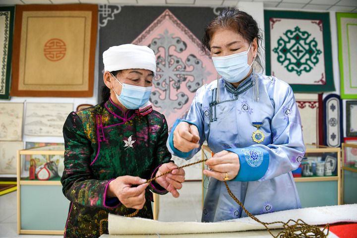3月4日,在苏尼特左旗非物质文化遗产保护中心,绣娘在制作《一叶红船映初心》。新华社记者贝赫摄