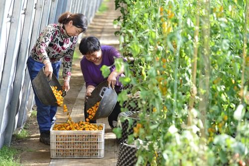 2月2日,在呼和浩特市经济作物工作站引种试验示范基地,工作人员收获越冬茬口感型番茄。新华社发(王正摄)