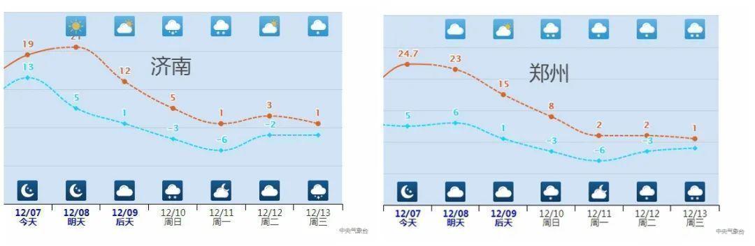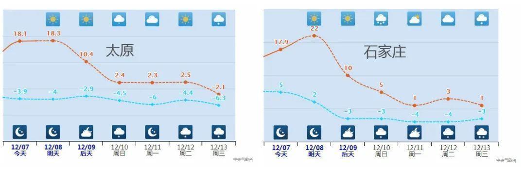 今天,中东部大部地区维持升温态势,多地将体验到12月同期罕见暖热。由于昼夜温差大,太原、石家庄等地一天可体验2个季节。然而,明天起,两轮冷空气“无缝衔接”,中东部多地将经历俯冲式降温:东北、华北、黄淮局地降幅超15℃,不少地方两三天最高气温累计降幅将超20℃。