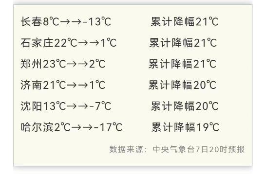 东北、华北南部、黄淮北部不少地方两三天最高气温累计降幅将超过20℃!