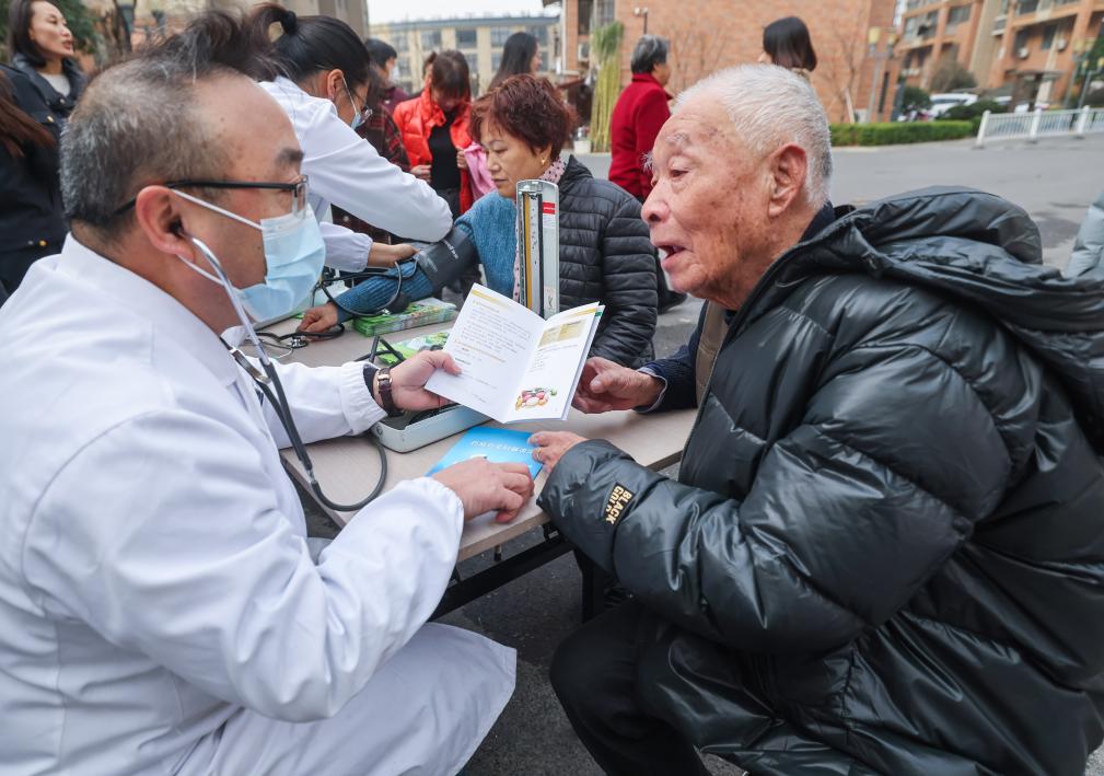 2023年12月13日,在浙江省湖州市吴兴区道场乡浮玉社区内,药店药剂师给居民普及安全用药知识。新华社记者徐昱 摄