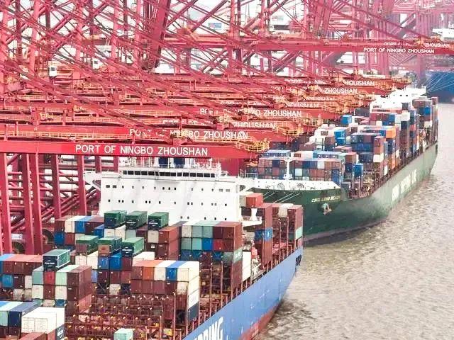 △远洋货轮在浙江宁波舟山港梅山港区装卸货物。