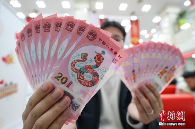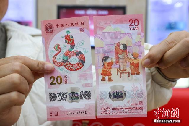 1月3日,贵州贵阳,市民在中国工商银行一支行展示纪念钞。当日,由中国人民银行发行的2025年贺岁纪念钞开始兑换。纪念钞面额20元,票面长145毫米,宽70毫米,采用塑料材质,发行数量为1亿张。中新社记者 瞿宏伦 摄