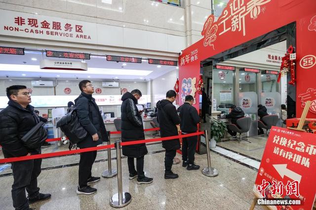 1月3日,贵州贵阳,市民在中国工商银行一支行排队等待兑换纪念钞、币。当日,由中国人民银行发行的2025年贺岁双色铜合金纪念币和纪念钞开始兑换。其中,双色铜合金纪念币面额10元,直径27毫米,材质为双色铜合金,发行数量为1亿枚;纪念钞面额20元,票面长145毫米,宽70毫米,采用塑料材质,发行数量为1亿张。中新社记者 瞿宏伦 摄