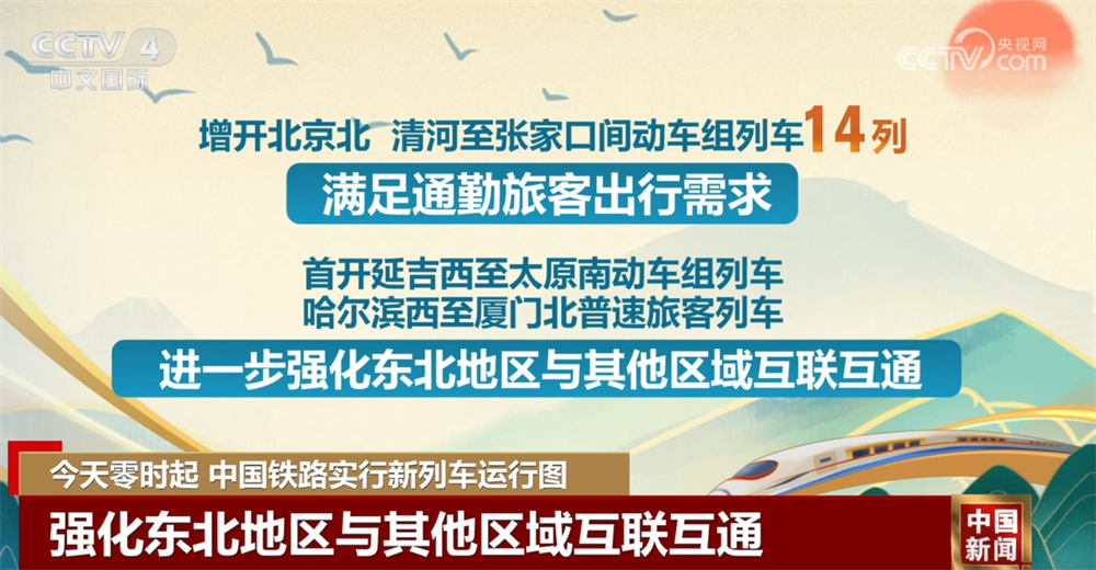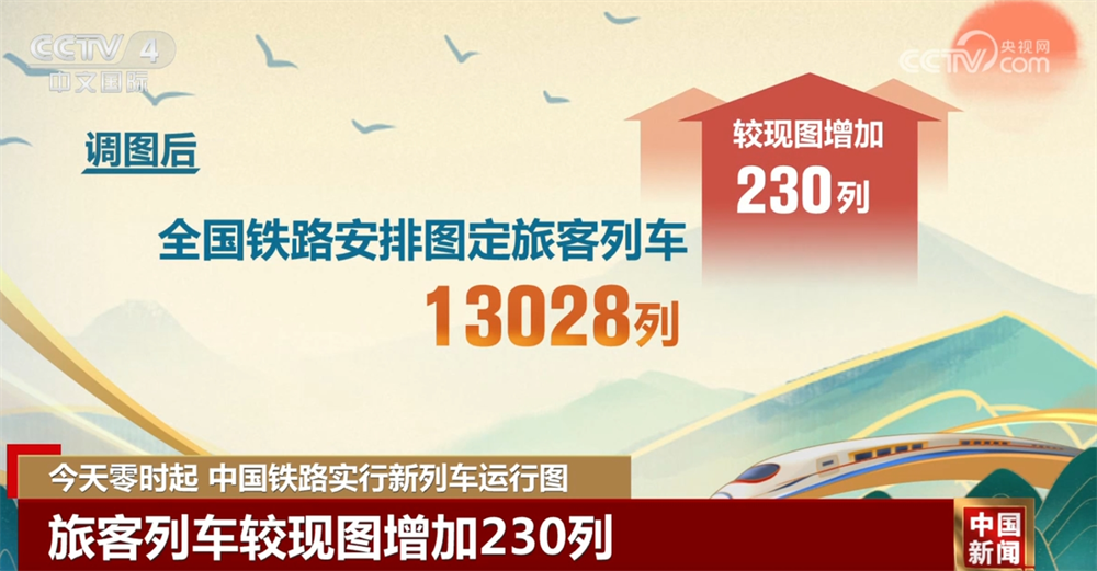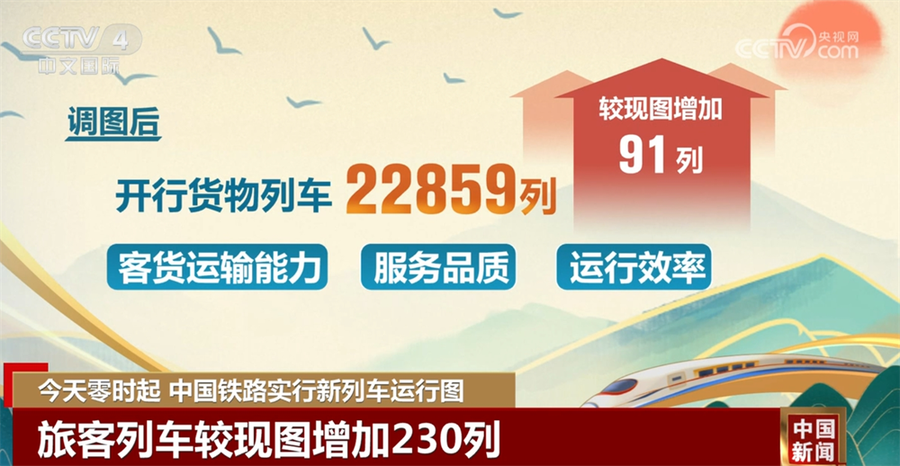调图后,全国铁路安排图定旅客列车13028列,较现图增加230列;开行货物列车22859列,较现图增加91列,铁路客货运输能力、服务品质和运行效率进一步提升。