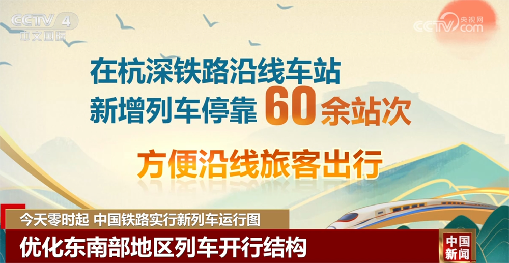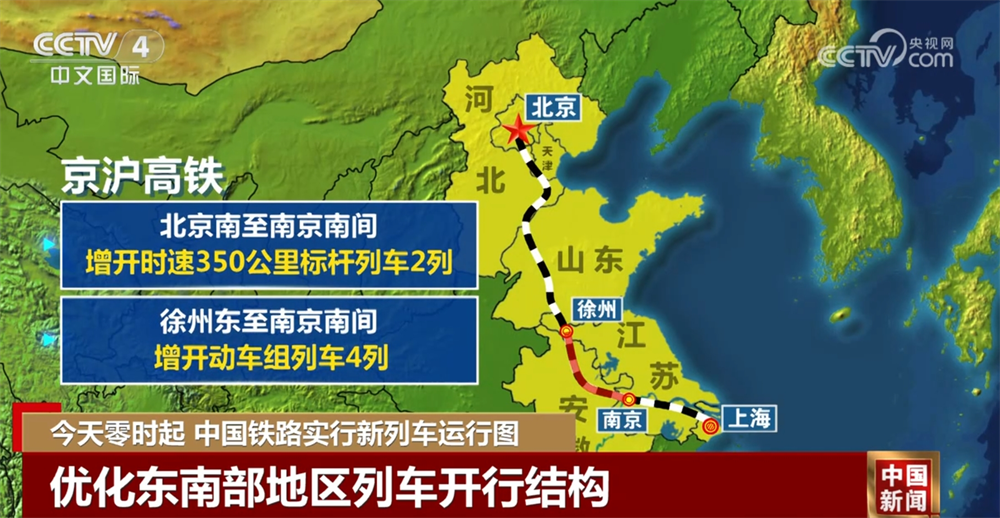 优化东南部地区列车开行结构。京沪高铁北京南至南京南间,增开时速350公里标杆列车2列、徐州东至南京南间增开动车组列车4列。在杭深铁路沿线车站新增列车停靠60余站次,方便沿线旅客出行。