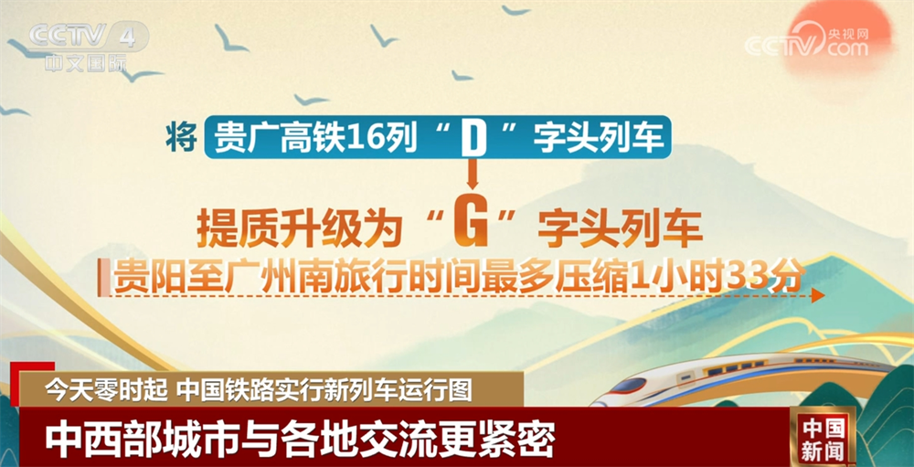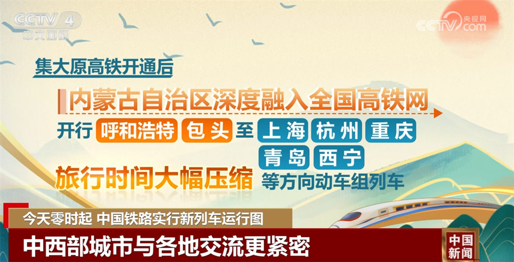 调整中西部高铁运行图。集大原高铁开通后,内蒙古自治区深度融入全国高铁网,开行呼和浩特、包头至上海、杭州、重庆、青岛、西宁等方向动车组列车,旅行时间大幅压缩;北京北(清河)站首次开行前往西安、兰州、成都等城市列车,加强首都与中西部城市间交流;利用南珠高铁南宁至玉林段,开行玉林北至南宁东间动车组列车18列。将贵广高铁16列“D”字头列车提质升级为“G”字头列车,贵阳至广州南旅行时间最多压缩1小时33分。