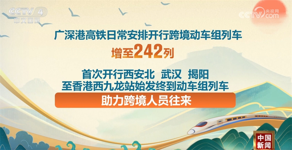 广深港高铁日常安排开行跨境动车组列车增至242列,首次开行西安北、武汉、揭阳至香港西九龙站始发终到动车组列车,助力跨境人员往来。
