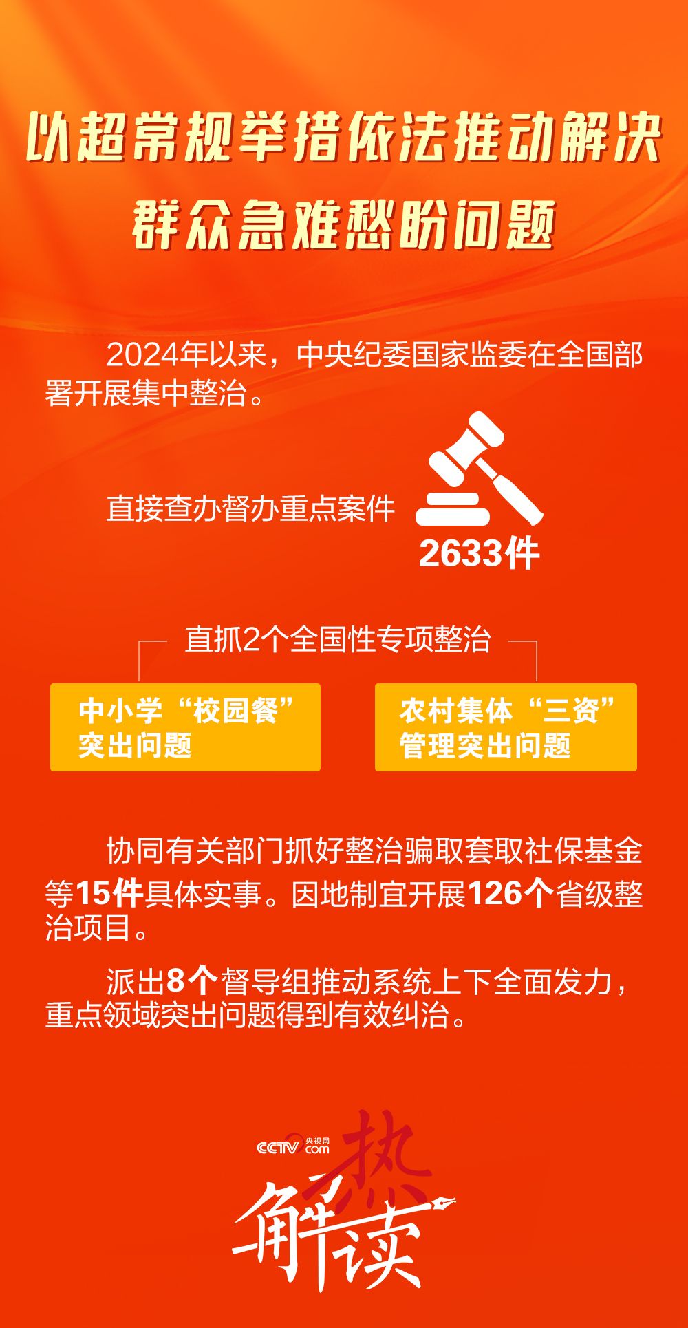 以“校园餐”问题为例。2024年,中央纪委国家监委督促有关部门首次摸清全国中小学食堂及供餐情况等底数,指导各级监察机关依法查处贪占学生餐费、插手招标采购、收受回扣等问题3.8万件,处分2.3万人。在斩断伸向“校园餐”的“黑手”的同时,补上了监管制度的漏洞。中央纪委国家监委会同教育部、市场监管总局、财政部等单位,制定“校园餐”管理监督指导意见,推动完善膳食经费管理等制度,确保每一笔资金来源与去向都在阳光下透明运作。