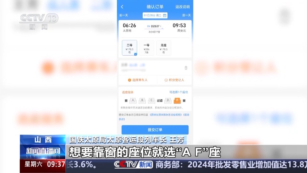 国铁太原局太原客运段列车长 王芳:登录12306网页或者手机App,您可以选择出行日期和车次,提交订单后,在剩余车票充足的情况下,即可进入选座界面。想要靠窗的座位就选“A、F”座,想紧邻过道就选“C、D”座。如果坐哪儿都行,不选择座席,就直接点击“确定”,系统将自动为您分配座位。
