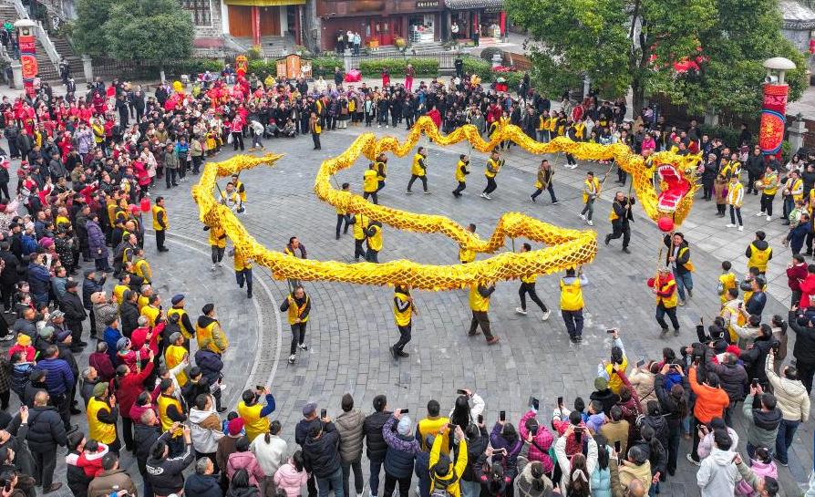△1月29日,在湖南湘西土家族苗族自治州凤凰县文化广场,群众舞龙欢庆新年。