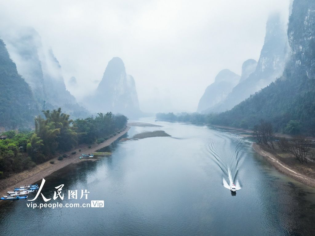 2025年2月6日,广西壮族自治区阳朔县漓江烟雨蒙蒙,远山如黛、近水含烟,小船在烟雨漓江中穿梭,勾勒出一幅秀美的水墨画卷。夏立慧摄(人民图片网)