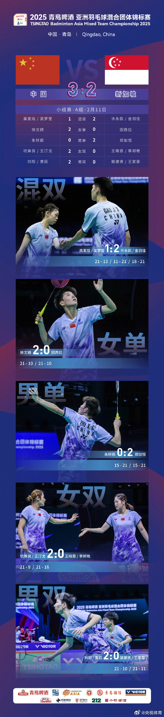 A组小组赛第一轮,中国队3-2战胜新加坡队,赢得开门红!