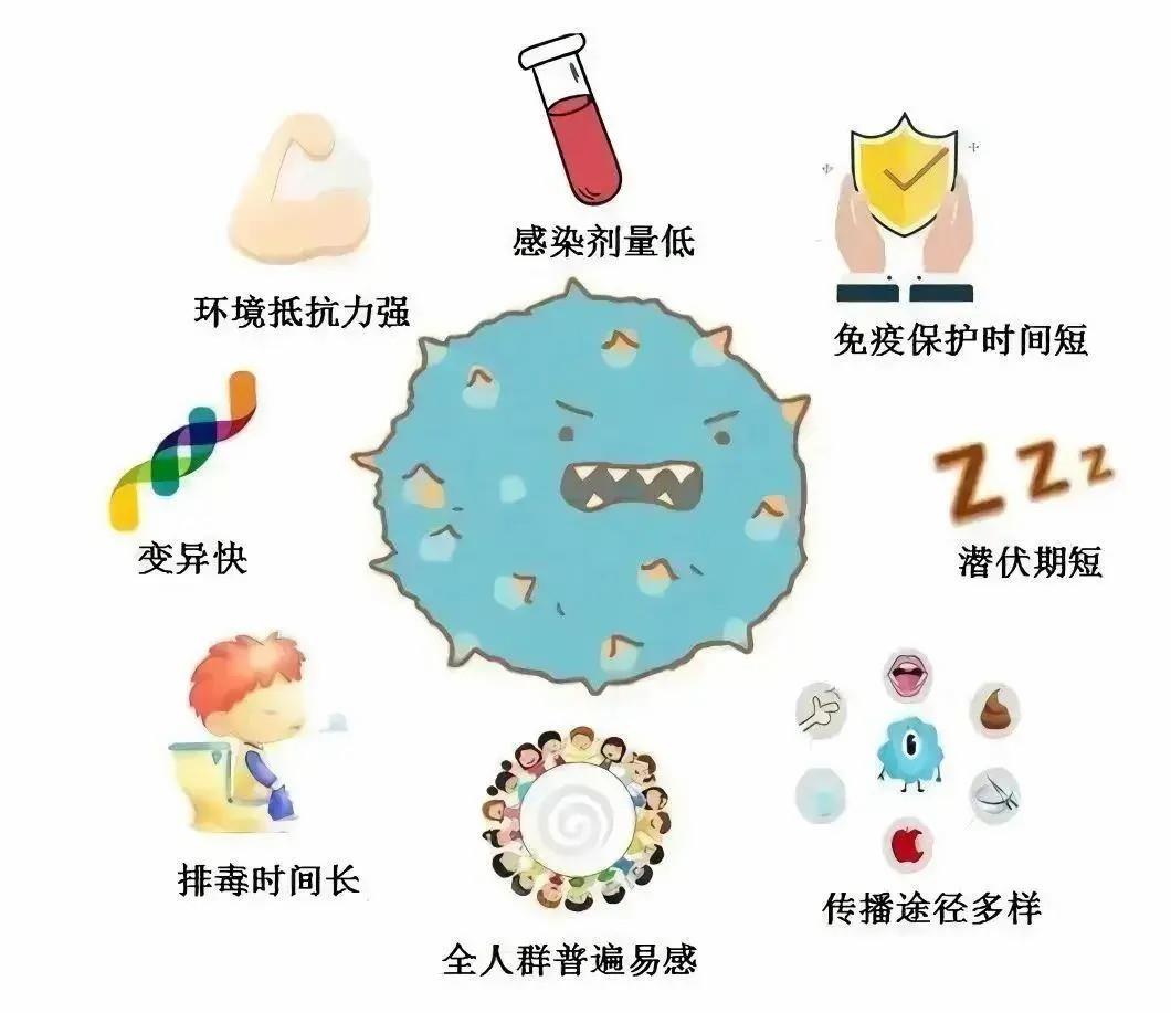 诺如病毒具有全人群普遍易感、感染剂量低(低至18个病毒颗粒即可引起感染)、感染后潜伏期短(通常24-48小时)、排毒时间长(排毒高峰在发病后2-5天,持续约2-3周)、外环境抵抗力强(可在0-60℃温度范围内存活)、免疫保护时间短(感染后免疫保护持续6-24个月,同一个体可重复感染同一毒株或不同毒株的诺如病毒)等特点。
