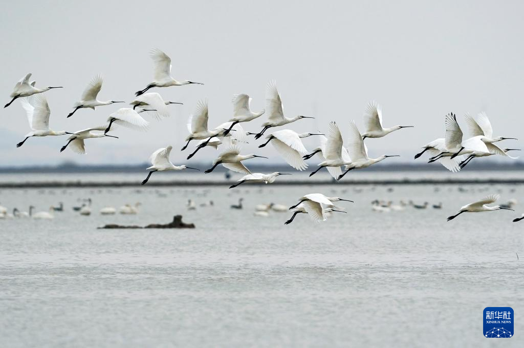 白琵鹭等候鸟在江西省南昌市新建区昌邑乡附近水域飞翔(2月18日摄)。