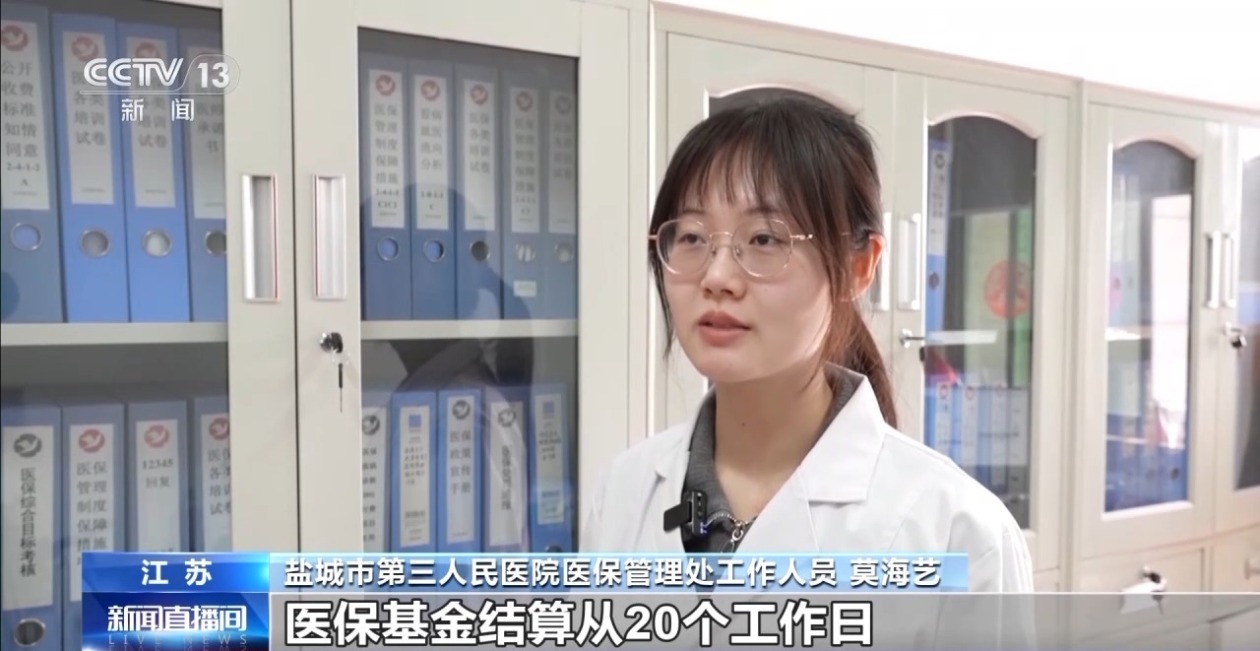 盐城市第三人民医院医保管理处工作人员 莫海艺:2025年1月份以来,医保基金结算从20个工作日缩短到1个工作日,极大减轻了医院的回款压力,提高了医院的资金流转效率。