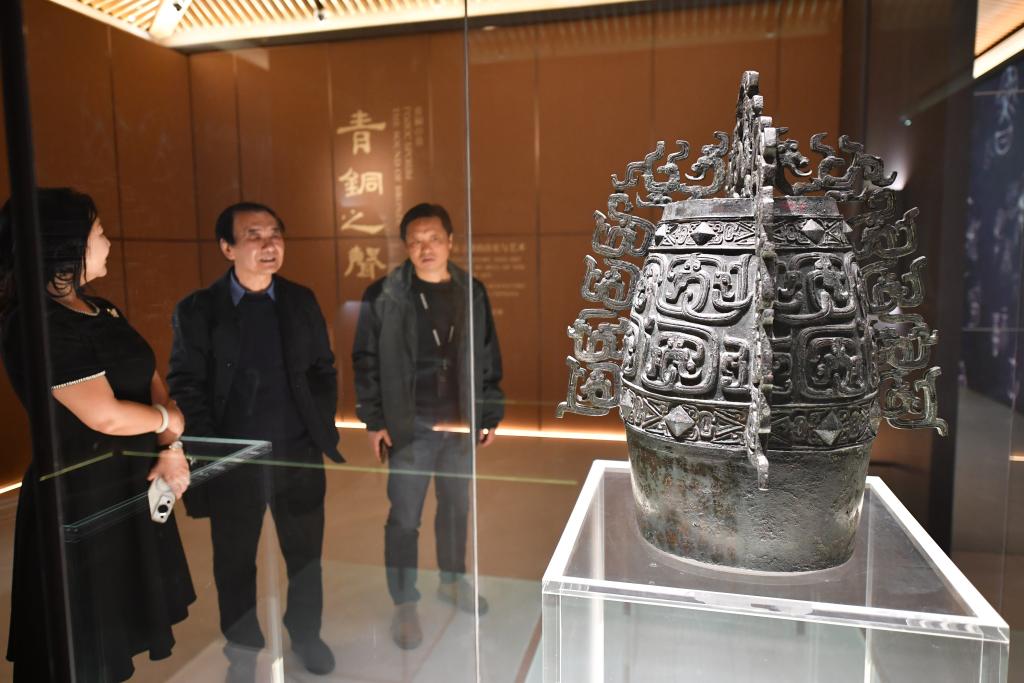 西安咸阳国际机场T5航站楼内的西部机场博物馆展出的国家一级文物秦公镈。新华社记者 邵瑞 摄