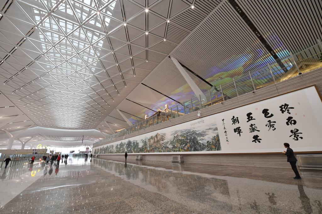 在T5航站楼出发大厅,一幅宽4米、长106米的巨幅画卷《终南景色秀 五岳共朝晖》同样引人瞩目。这幅巨作由多位艺术家共同创作,展现了祖国的壮丽河山,吸引许多过往旅客驻足观看。