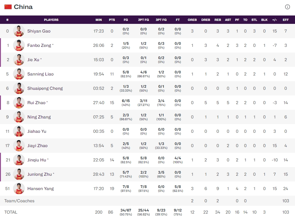 此后廖三宁连得5分,朱俊龙也命中底角三分球彻底终结比赛悬念,最终中国队86-78战胜关岛男篮。