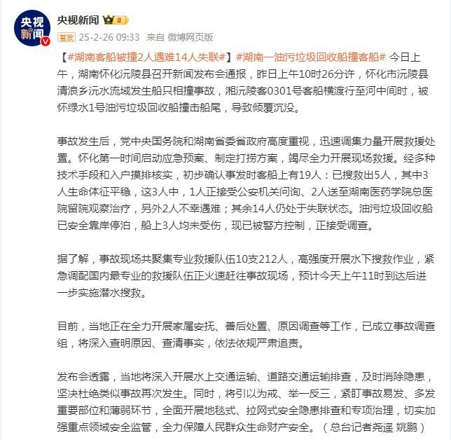 事故发生后,党中央国务院和湖南省委省政府高度重视,迅速调集力量开展救援处置。怀化第一时间启动应急预案、制定打捞方案,竭尽全力开展现场救援。经多种技术手段和入户摸排核实,初步确认事发时客船上有19人:已搜救出5人,其中3人生命体征平稳,这3人中,1人正接受公安机关问询、2人送至湖南医药学院总医院留院观察治疗,另外2人不幸遇难;其余14人仍处于失联状态。油污垃圾回收船已安全靠岸停泊,船上3人均未受伤,现已被警方控制,正接受调查。