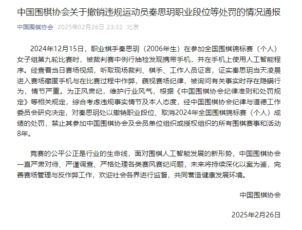 央视网消息:中国围棋协会2月26日通报,2024年12月15日,职业棋手秦思玥(2006年生)在参加全国围棋锦标赛(个人)女子组第九轮比赛时,被裁判赛中例行抽检发现携带手机,并在手机上使用人工智能程序。经查看当日赛场视频,听取现场裁判、棋手、工作人员证言,证实秦思玥当天凌晨进入赛场藏匿手机与在比赛过程中作弊,藐视赛场纪律,被询问有关事实时存在隐瞒行为,情节严重。为正风肃纪,维护行业风气,根据《中国围棋协会纪律准则和处罚规定》等相关规定,综合考虑违规事实情节及本人态度,经中国围棋协会纪律与道德工作委员会研究决定,对秦思玥处以撤销职业段位、取消2024年全国围棋锦标赛(个人)成绩的处罚,禁止其参加中国围棋协会及会员单位组织或授权组织的所有围棋赛事和活动8年。