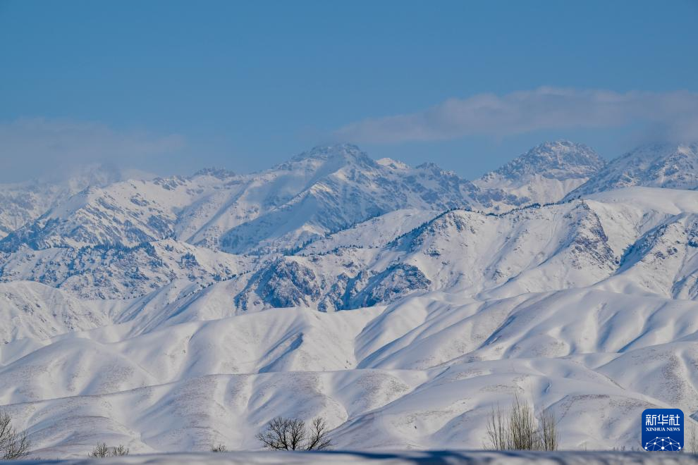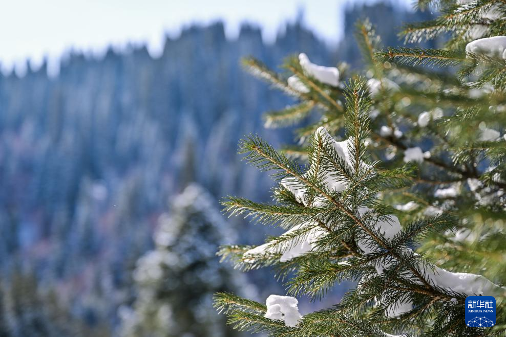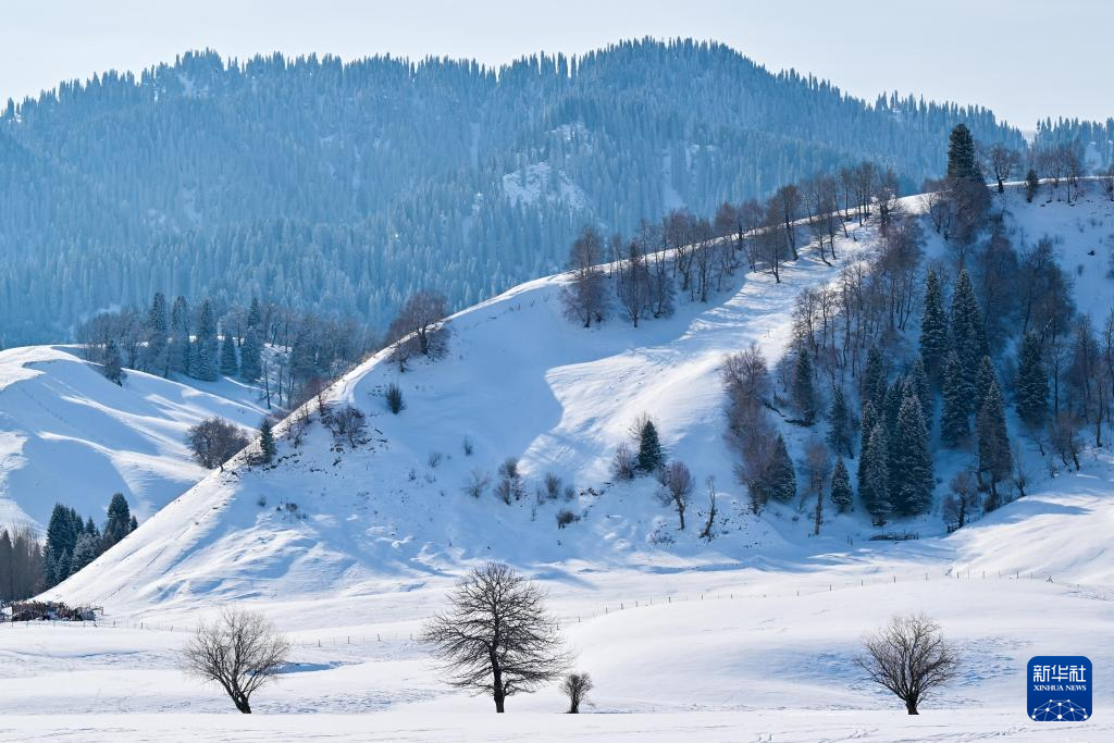 一场降雪过后,位于新疆伊犁哈萨克自治州新源县的新疆那拉提国家旅游度假区一片银装素裹。连绵起伏的草坡被白雪覆盖,巍峨的山峰格外壮观。松林在冰雪中屹立,阳光洒落,美不胜收。(新华社记者 丁磊 摄)