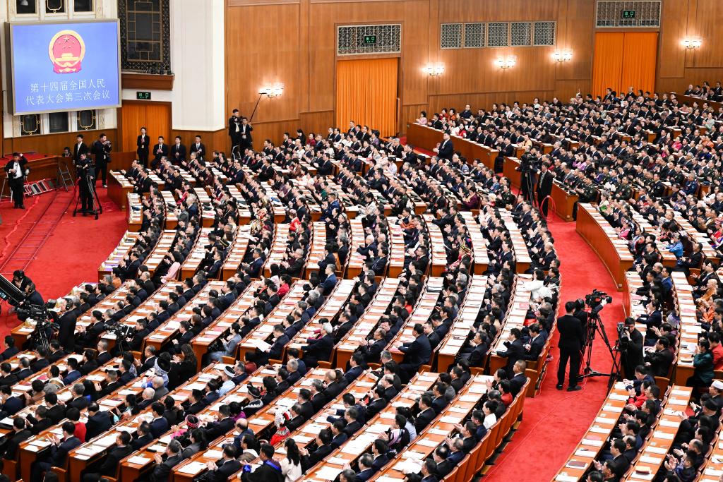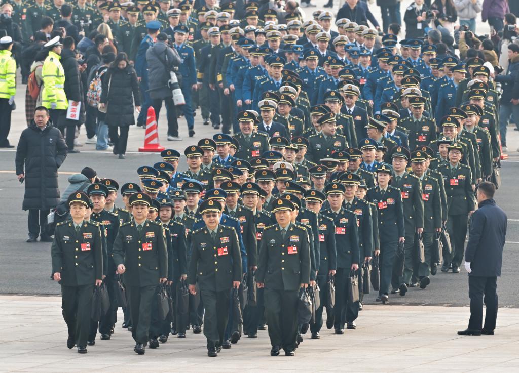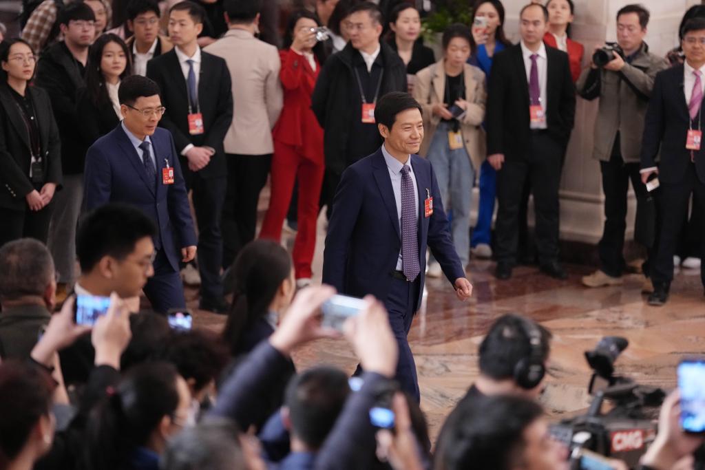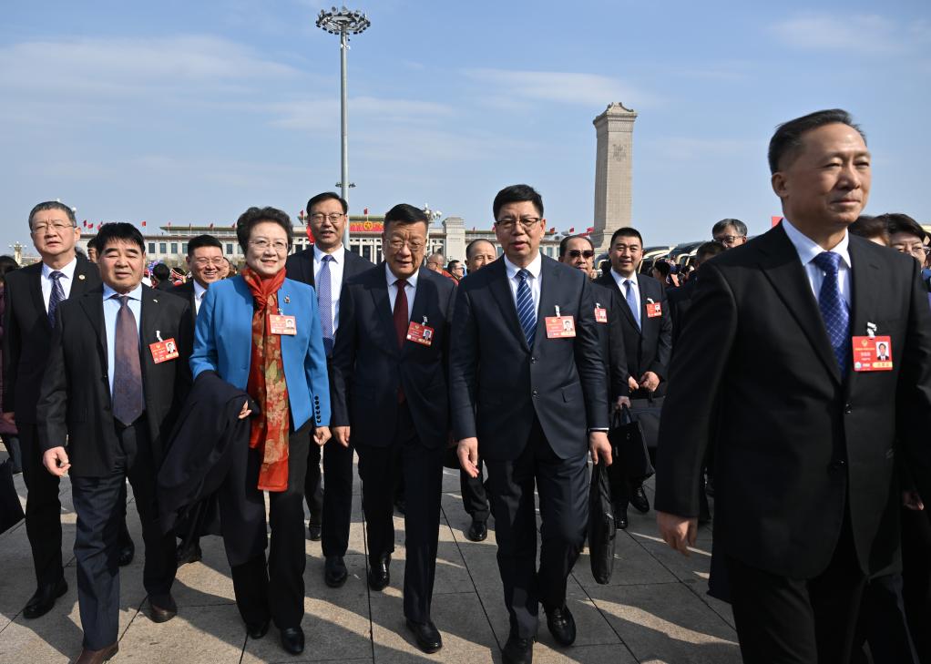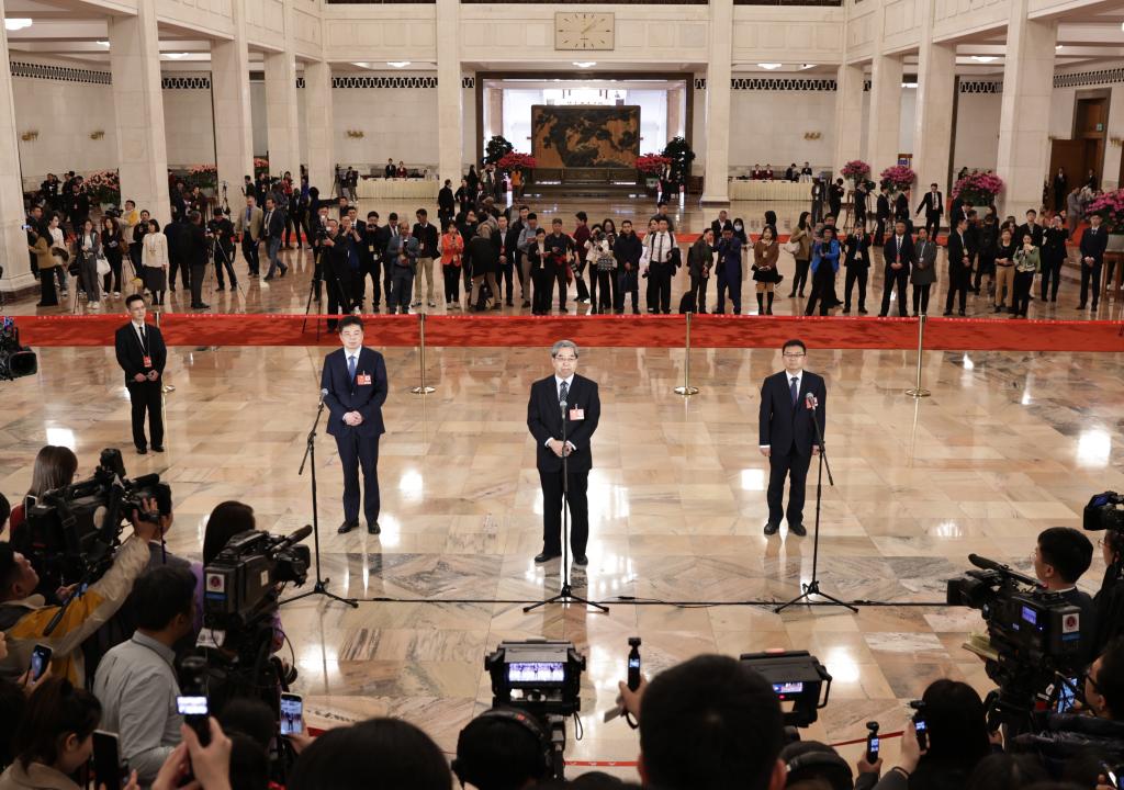 3月5日举行的首场“代表通道”集中采访活动上,接受采访的全国人大代表入场。