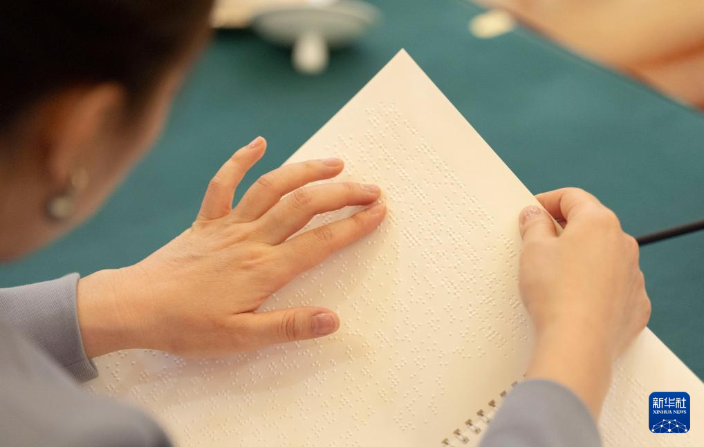 3月5日,在全国政协十四届三次会议社会福利和社会保障界别小组会议现场,政协委员触摸盲文版政府工作报告。