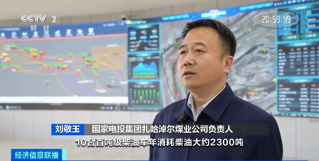 国家电投集团扎哈淖尔煤业公司负责人 刘敬玉:10台百吨级柴油车年消耗柴油约2300吨,燃油费约1800万元;同等数量电卡年消耗电量约1000万度,电费约650万元。