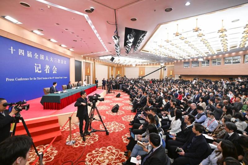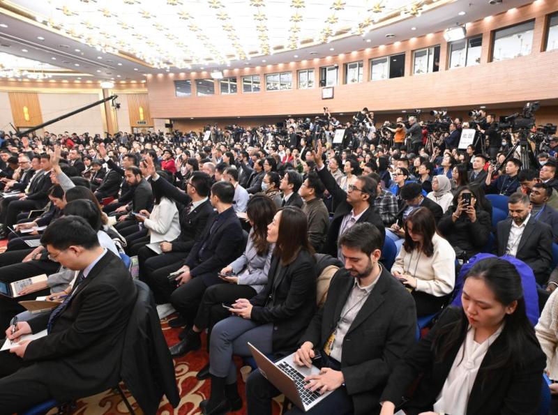 3月7日,十四届全国人大三次会议在北京梅地亚中心新闻发布厅举行记者会。中共中央政治局委员、外交部长王毅就中国外交政策和对外关系回答中外记者提问。这是记者在现场采访。新华社记者 陈晔华 摄