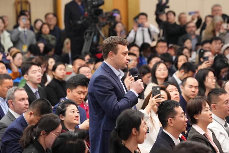 3月7日,十四届全国人大三次会议在北京梅地亚中心新闻发布厅举行记者会。中共中央政治局委员、外交部长王毅就中国外交政策和对外关系回答中外记者提问。这是记者在提问。 新华社记者 李笑 摄