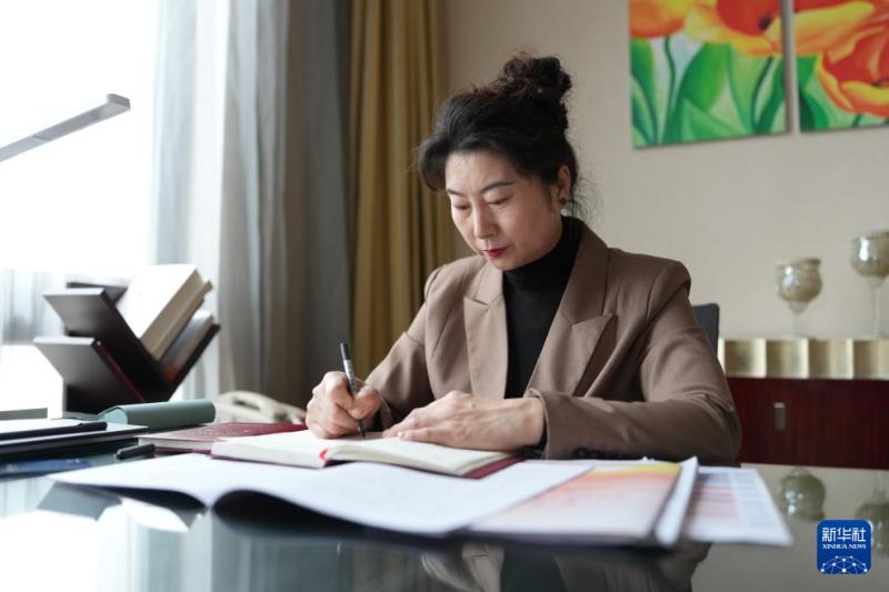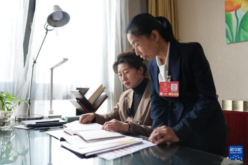 3月3日,在吉林代表团驻地,马秀娟(左)与徐艳茹代表交流。