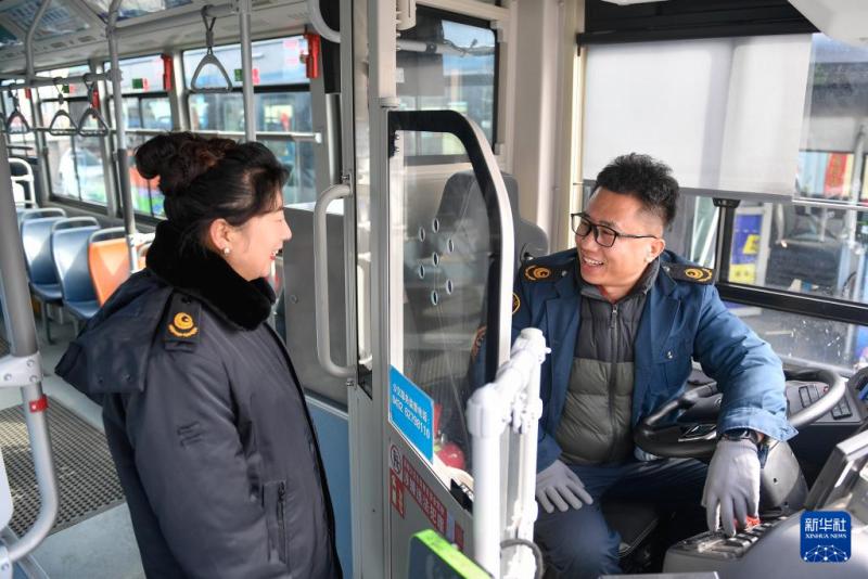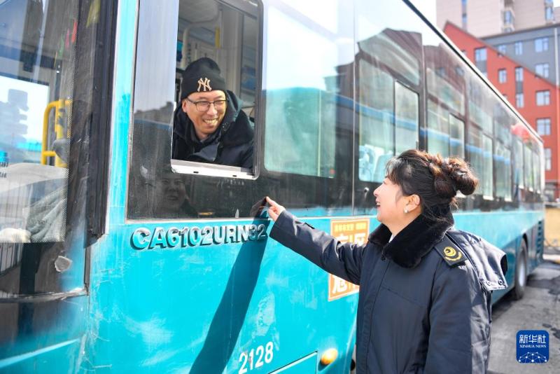 在吉林市城市公共交通集团有限公司第四分公司,马秀娟(左)与一名公交车驾驶员交谈(2月25日摄)。
